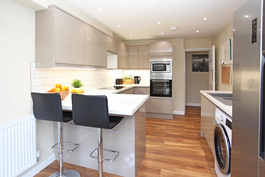 The property comes with two modern & pleasantly decorated bathroom suites which include close coupled toilet, pedestal hand basin, and a newly re-fitted walk-in shower with tiling and wall mounted radiator. Leading from the entrance hallway, you are greeted to a brand new modern integrated kitchen with built-in oven, extractor fan, American style fridge/freezer, kettle, microwave, brand new utensils, cutlery, wall and base mounted units offering ample space for everyone. The kitchen also has a communal dining area, perfect for socializing.