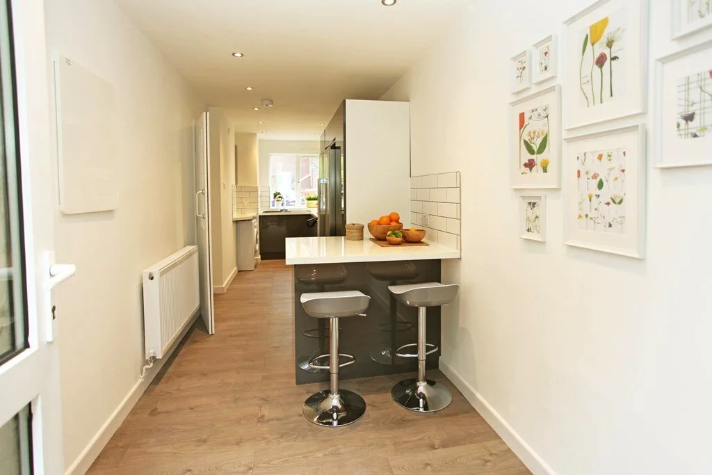 The property comes with two modern & pleasantly decorated bathroom suites which include close coupled toilet, pedestal hand basin, and a newly re-fitted walk-in shower with tiling and wall mounted radiator. Leading from the entrance hallway, you are greeted to a brand new modern integrated kitchen with built-in oven, extractor fan, American style fridge/freezer, kettle, microwave, brand new utensils, cutlery, wall and base mounted units offering ample space for everyone. The kitchen also has a communal dining area, perfect for socializing.
